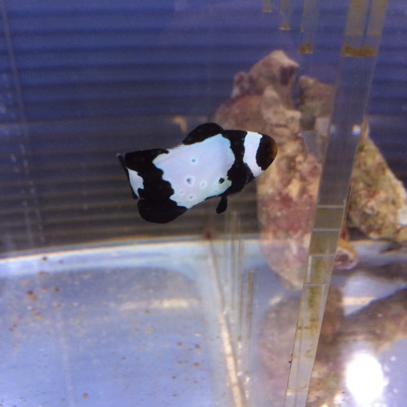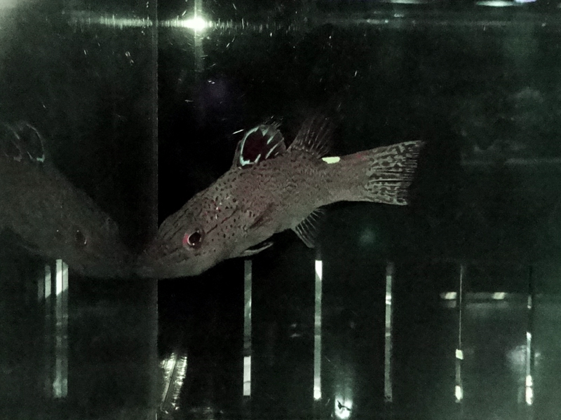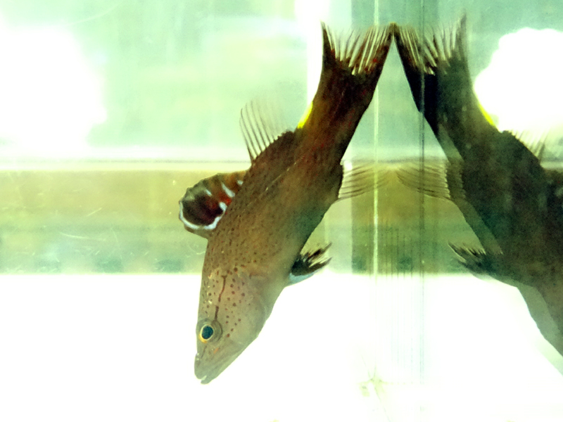 ヤミスズキ。精悍な顔つきです。黒い体に尾の付け根の黄色いスポットが鮮やかです。