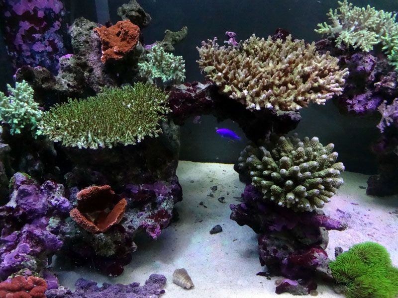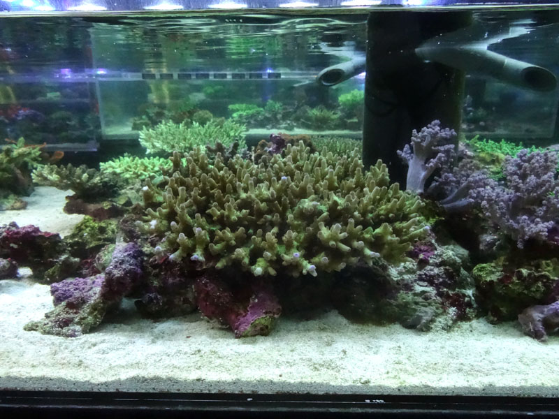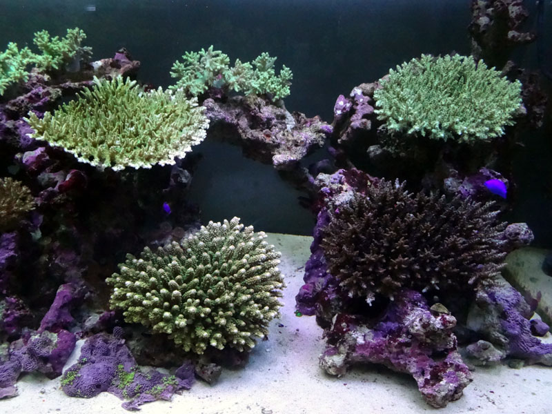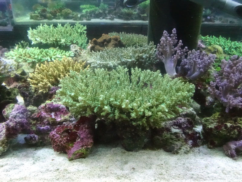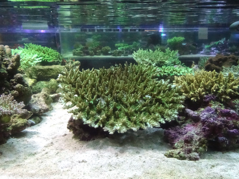 1800(w)600(h)の水槽にレイアウトされていますが右約半分の画像です。ミドリイシ4個でいっぱいな感じです。でかいです‼︎