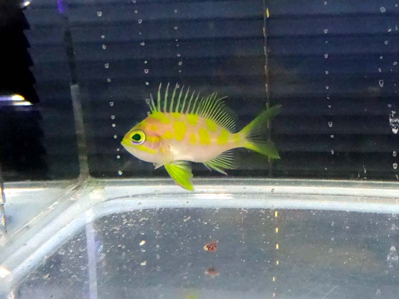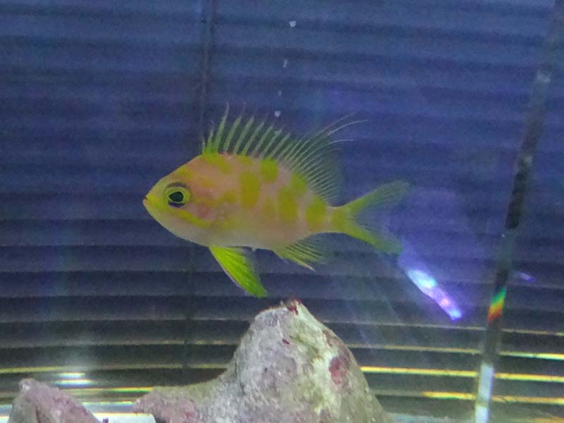 4.5㎝位の小さな個体です。ピンク色の体に黄色いマダラ模様で大変綺麗なハナダイの仲間です。餌付きやすく丈夫で飼育しやすい種類です。