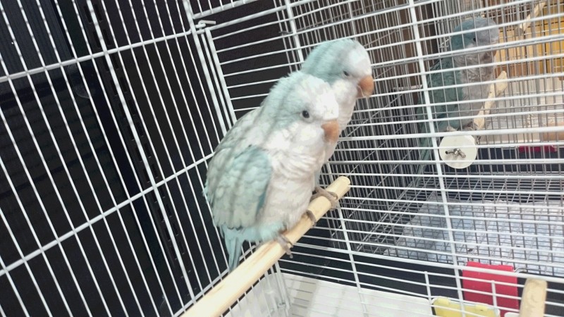 隣のカゴで写っている同じくオキナインコのブルーちゃんと比べてみると、