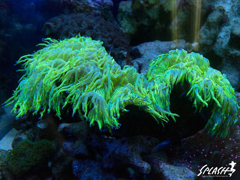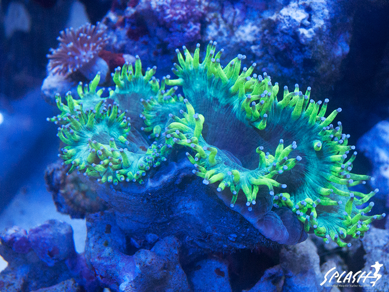 スーパー蛍光グリーンの固体は、入荷直後の写真のためポリプの開きがまだ完全ではありませんが、とにかくカラーが凄いため、お写真をアップいたしました。