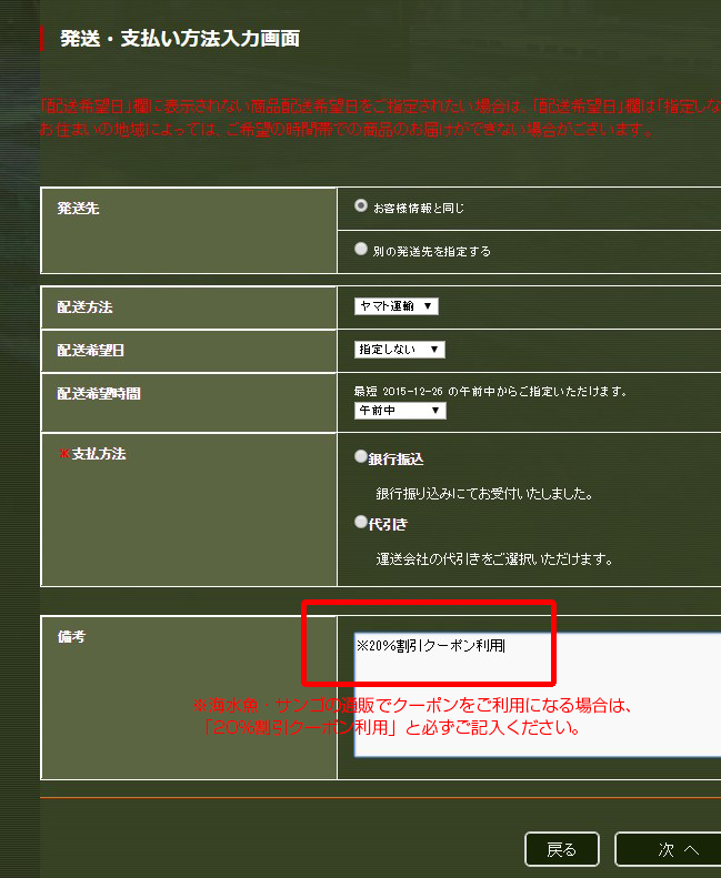 以下は、カートからお進みいただいた際に表示される「発送・支払い方法入力画面」の「備考」欄に「※20%割引クーポン利用」と記載した参考イメージとなります。